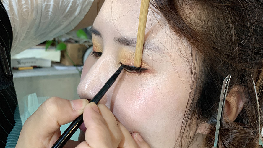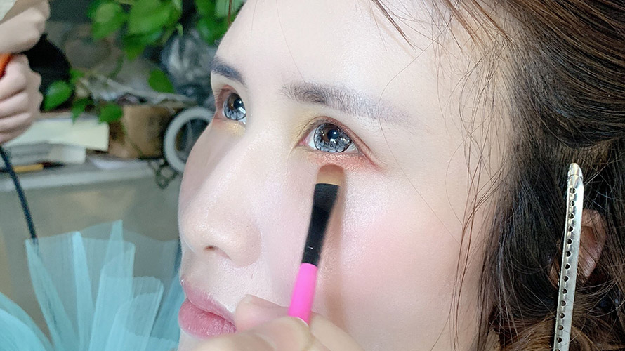 下眼影也不要忘記哦,畫下眼影的時候要讓新娘眼睛向上方看,采用相同對應(yīng)的眼影,自然的暈開,注意眼影的取量,一定要少量多次哦。