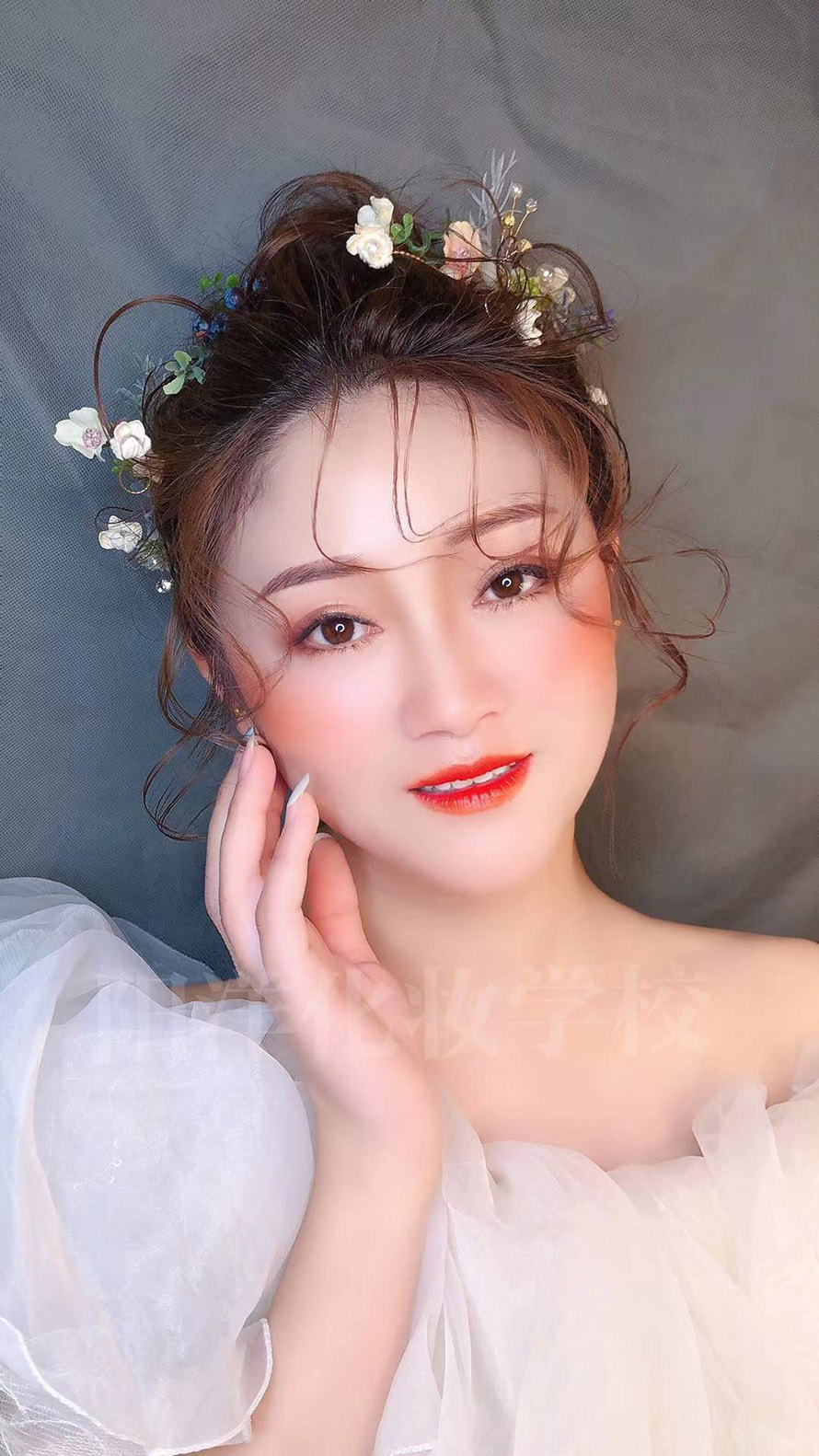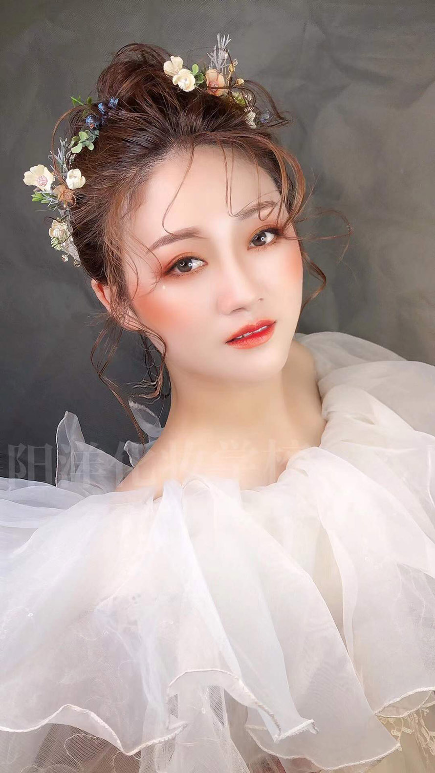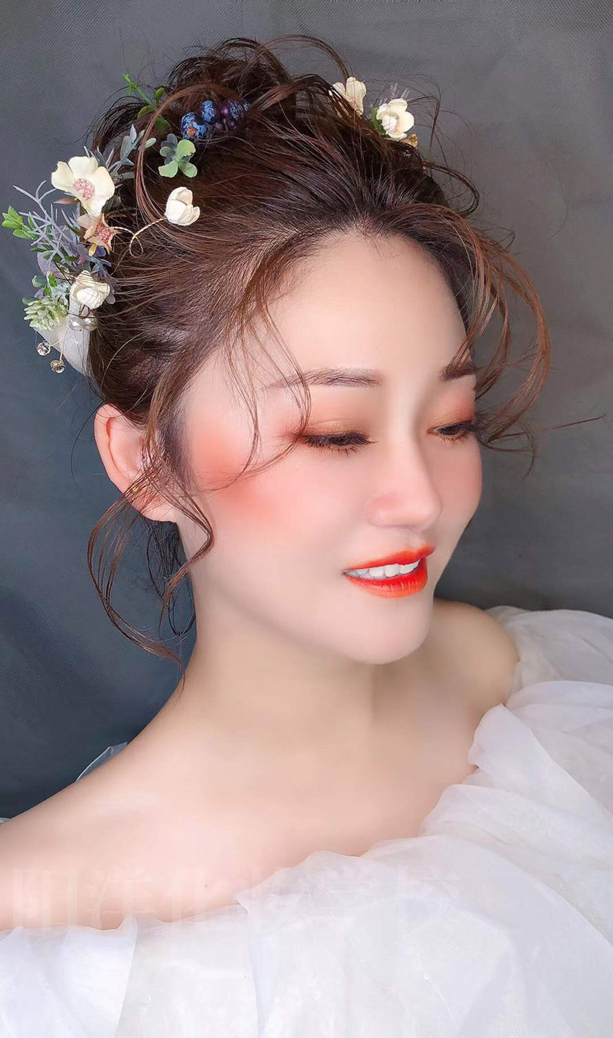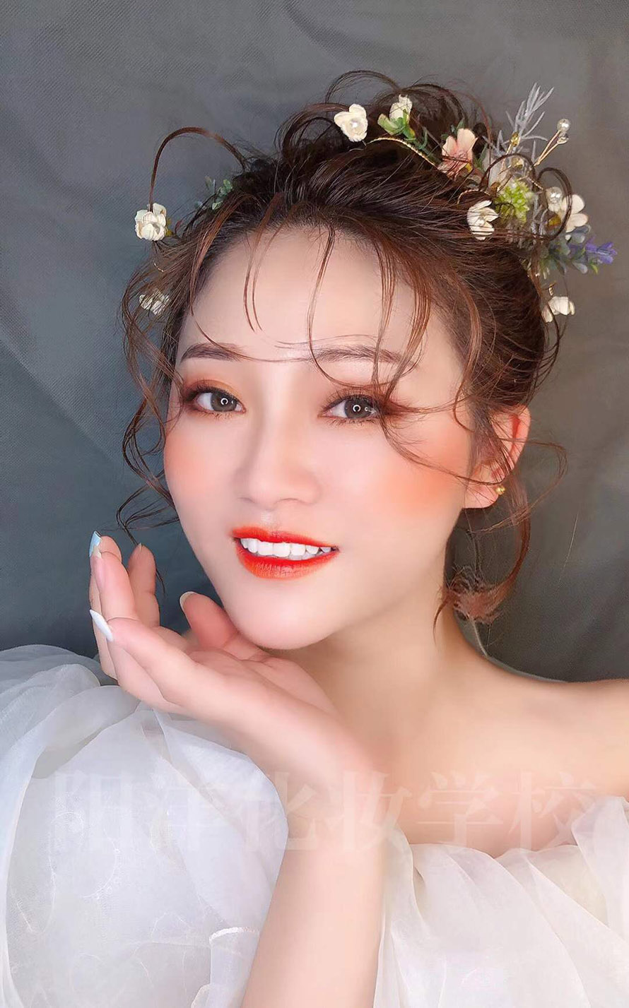 手法簡約忌堆疊——整體造型,重在突出新娘柔美的身線和真實(shí)、自然的美。做造型時不宜采用過多的造型物品來堆砌,亦不可濃妝艷抹,而應(yīng)理性地采用輕描淡寫的手法,運(yùn)用較少量的化妝品和柔淡的彩妝色,突顯新娘的自然美。
