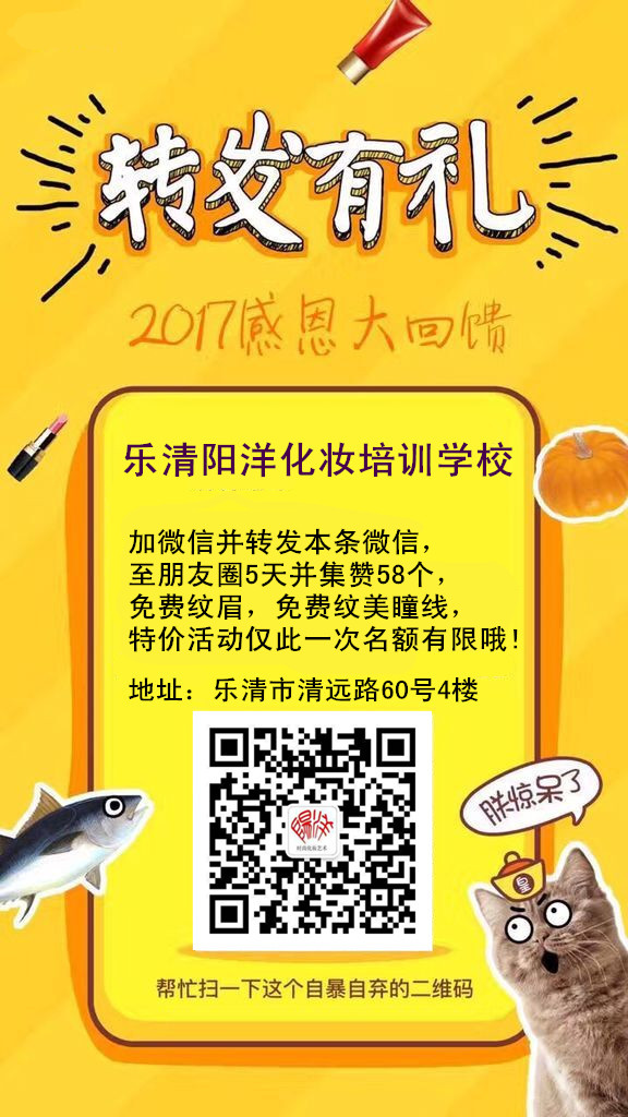 呼應寶寶們的強烈要求,樂清陽洋時尚化妝培訓學校年底來一次半永久活動哈~轉發(fā)此文至朋友圈5天并集贊58個+關注公眾號(yysshz567),就可以免費做韓式半永久紋眉或者美瞳線哦,還有呢!轉發(fā)第二天就可以打電話預約名額嘍~~進口機器進口色料,記得提前預約時間操作,由于參加活動的寶寶太多,名額有限,滿額恢復原價,雖然是活動也代表著陽洋化妝學校的聲譽,低價不低品質、轉發(fā)朋友圈十天并集贊68個 并關注公眾號(yysshz567),報名學習陽洋化妝課程立減1000元現(xiàn)金! ![]()