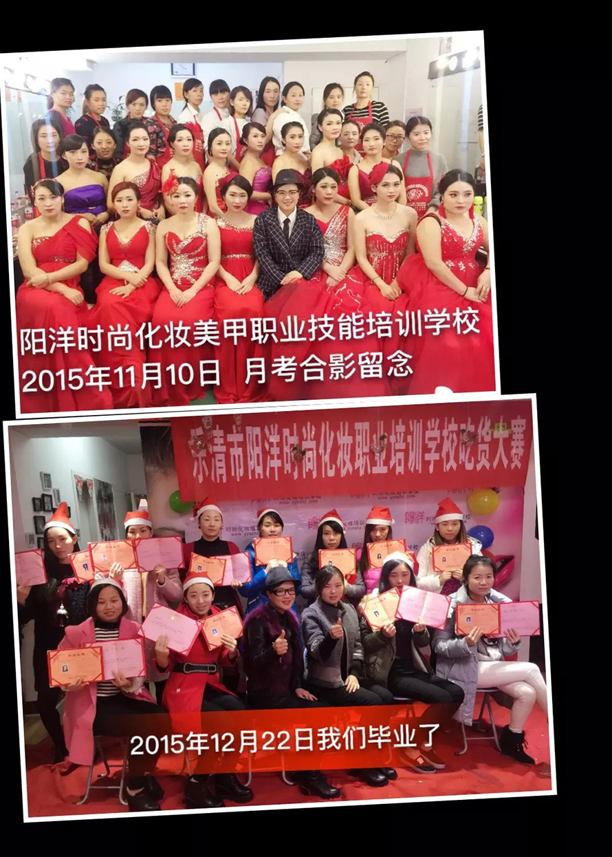 一直到15年8月才正式接觸化妝,在選擇化妝學校的時候也是非常的糾結,那么家學校不知道該怎么選擇,最后在表姐的介紹下,我來到了樂清陽洋時尚化妝職業(yè)培訓學校,看了課程聽了老師的介紹后報了四個月化妝盤發(fā)美甲精英班,每個月都是學不一樣的課程,前面是學是基礎,生活妝等,我們第一堂課上的就是化妝師職業(yè)規(guī)范,因為我們的老師就是校長,他和我們說一個很負責的化妝師就應該有一個好的形象以及好的品行,老師上課都是手把手的教,每天都必須過關,在平時我們的生活上也很關心我們,很照顧我們大家,這讓我們有種家的感覺,然后就是是發(fā)型課程老師每天都會來看我們的學習情況,并幫我們指出不足,并讓我們改正,我最喜歡的是第四個月的課程學習的妝面都是每天不一樣的,也很夸張,各種各樣的妝面,別人能夠想到的妝面我都能完成,適應社會需求,得心應手,在陽洋學校還交到很多朋友,雖然我們年齡差很多,雖然我們來自不同的地方,但是我們很快學融入在一起了,他們都很幫助,照顧我,我們之間沒有代溝,在一起學習跟開心。 在這里要感謝樂清陽洋時尚化妝職業(yè)培訓學校的各位老師,在他們的細心教導下,我相信成為化妝師的夢想會越來越近的想想自己以后可以憑借自己所學把人家變得漂亮,更能養(yǎng)活家里人,就有一種成就感還有幸福感。再次感謝各位老師對我的嚴格,和悉心教導,沒有你們就沒有今天的我,真心感謝!