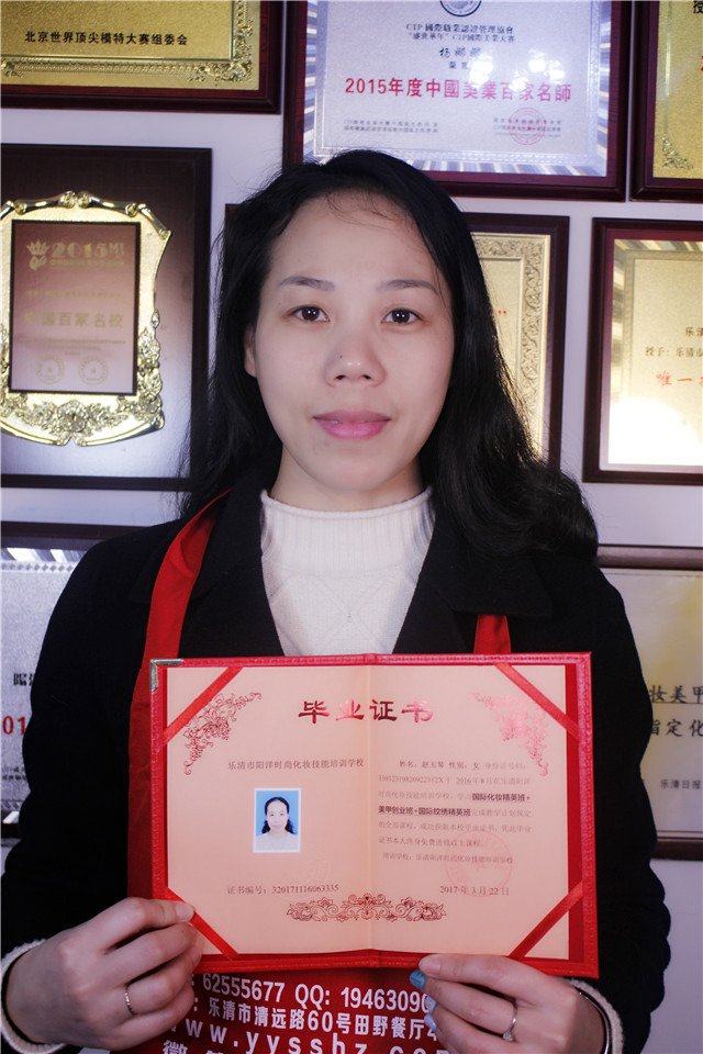 當(dāng)前位置:樂(lè)清市陽(yáng)洋職業(yè)技能培訓(xùn)學(xué)校 » 學(xué)員感悟樂(lè)清陽(yáng)洋化妝培訓(xùn)學(xué)校趙玉琴同學(xué)化妝美甲紋繡全科班畢業(yè)感言!發(fā)布時(shí)間:2017-3-30 19:02:07瀏覽次數(shù):1986  |