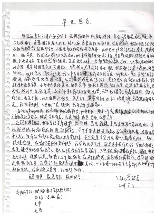 當(dāng)前位置:樂(lè)清市陽(yáng)洋職業(yè)技能培訓(xùn)學(xué)校 » 學(xué)員感悟李昭君同學(xué)畢業(yè)感言發(fā)布時(shí)間:2019-8-13 20:15:43瀏覽次數(shù):1964 |