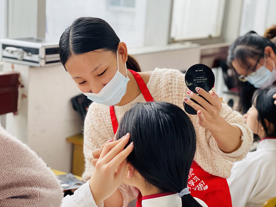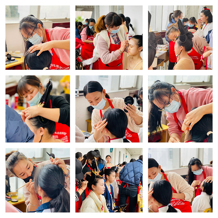 駱良分同學正在給表演者化妝花絮 我們的駱良分同學,大家都親切的喊她駱駱。是一位來自貴州超能吃苦由勤快的90后寶媽。 在2020年9月以前還是加油站的一名上班10多年的小職員,她說年復(fù)一年日復(fù)一日,這樣的日子不知道有什么盼頭。她下定決心,想改變自己的形象,換一下工作環(huán)境,為自己的以后努力爭取一下。在朋友的推薦下,她來到陽洋化妝學校報名學習化妝+美甲+美睫+美容+紋繡課程。學習了這么多課程,把學習時間靈活運用到極致。白天學習化妝晚上學習紋繡,紋繡學習好之后在繼續(xù)學習美容課程。這幾門課程學好之后再學習美甲美睫。每天做作業(yè)到半夜,一大早還要送孩子上學。我們問她這樣每天跟時間賽跑累嗎?她堅定的告訴我們:我不累!我覺得自己很充實,學習很開心!每天正能量滿滿的她,傳播給每一位身邊的人,性格開朗,大大方方,每一次實習從不缺席。正是這樣的努力刻苦,讓她變得越來越優(yōu)秀。好樣的,駱駱!