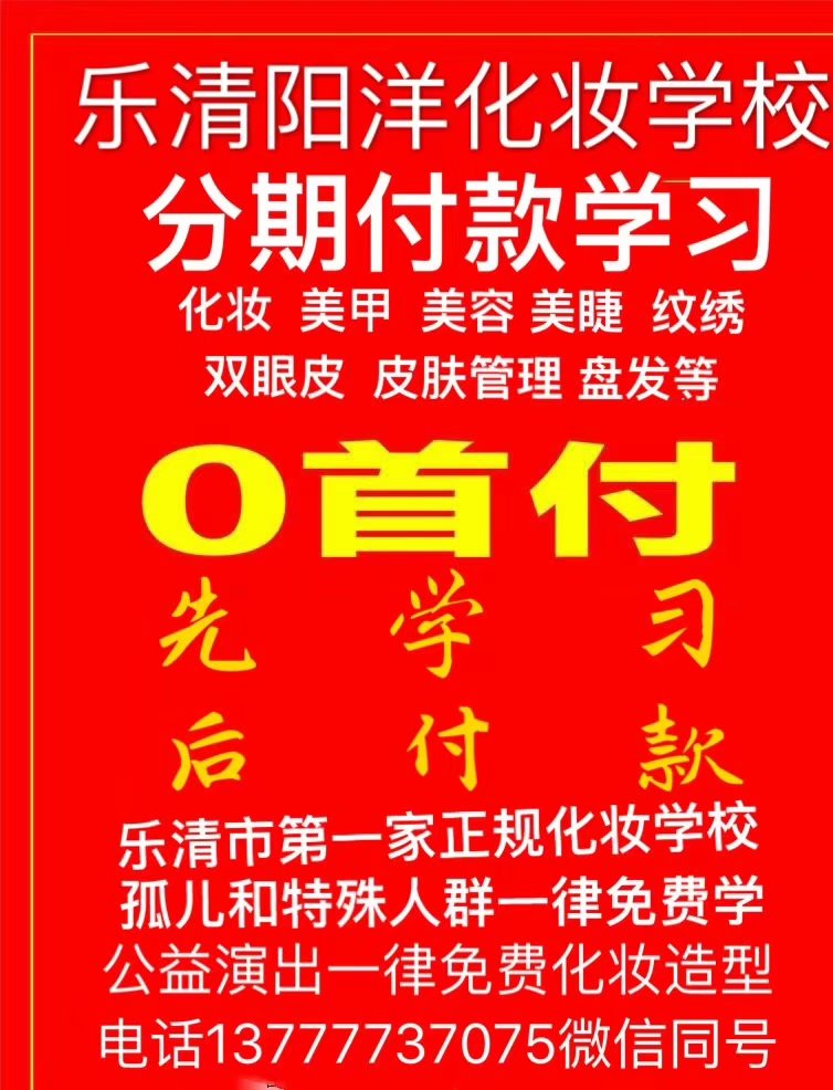 陽洋化妝美甲紋繡技能培訓(xùn)學(xué)校 七大專業(yè)王牌課程,化妝,發(fā)型,紋繡,雙眼 皮,美甲美睫美容。火熱報名中...... 可分期付款,0首付,學(xué)習沒壓力 總校報名熱線:0577-62555677;13777737075 微信:yysshz0188 QQ:1679086288;3193458088 總校地址:樂清市清遠路60號4樓-6樓 學(xué)校網(wǎng)址:m.fy2l.com 柳市分校報名熱線:0577-62556767 13777737075 微信:lsyyhz55 地址:柳市鎮(zhèn)柳江北路1號 四樓聯(lián)盈辦公家具專賣樓上(夏威夷大酒店對面 中國銀行旁邊) 學(xué)校網(wǎng)址:m.fy2l.com