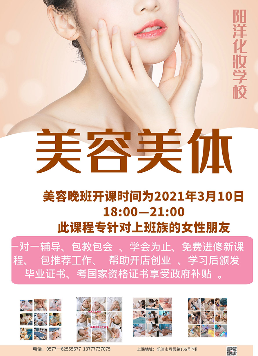 當(dāng)前位置:樂(lè)清市陽(yáng)洋職業(yè)技能培訓(xùn)學(xué)校 » 學(xué)校新聞2021年3月美容晚班開課 樂(lè)清哪里有學(xué)美容?發(fā)布時(shí)間:2021-3-10 14:52:31  瀏覽次數(shù):1956  |