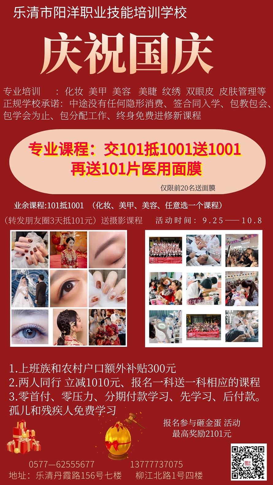 當(dāng)前位置:樂清市陽(yáng)洋職業(yè)技能培訓(xùn)學(xué)校 » 學(xué)校新聞陽(yáng)洋2021國(guó)慶活動(dòng)火爆來(lái)襲#溫州樂清柳市虹橋哪里有學(xué)化妝美甲紋繡美睫美容?發(fā)布時(shí)間:2021-9-26 9:52:36 瀏覽次數(shù):1960 |