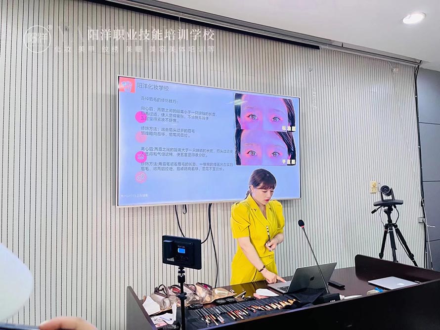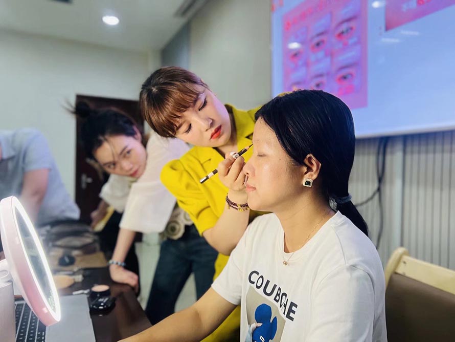 首先講課理論知識——實(shí)踐給學(xué)生看——再一對一改妝——30多人老師一對一的改,