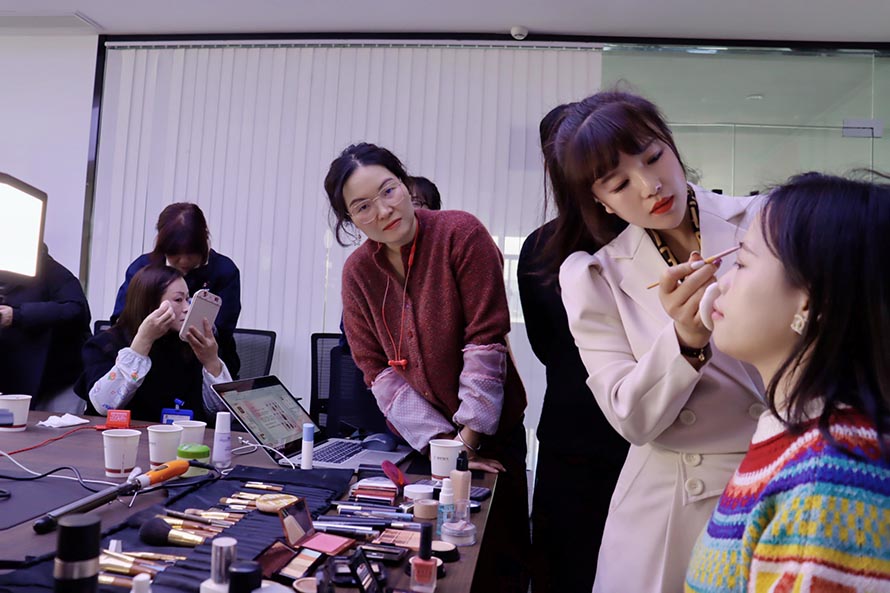 妝容實(shí)操中,實(shí)操過程中一邊教學(xué),