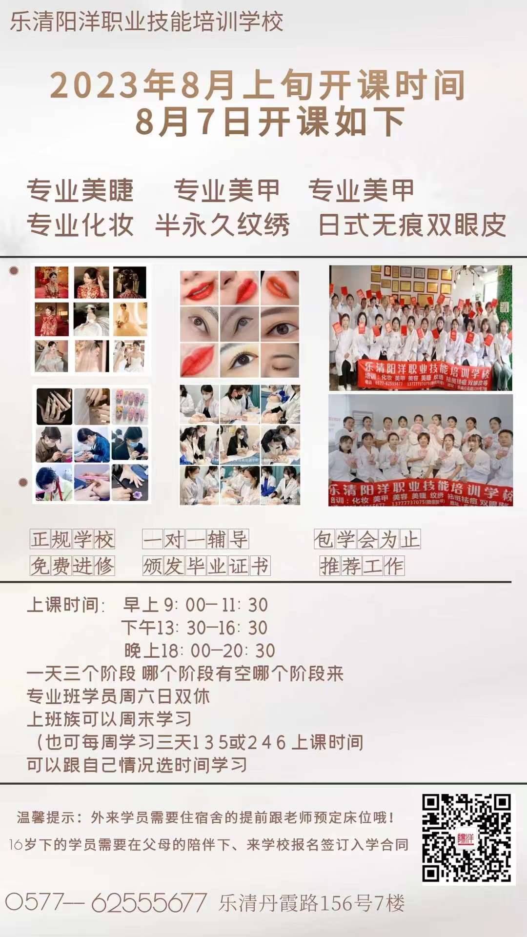 當(dāng)前位置:樂清市陽(yáng)洋職業(yè)技能培訓(xùn)學(xué)校 » 學(xué)校新聞八月新班開課,八月七日起,快來加入我們吧發(fā)布時(shí)間:2023-8-2 19:01:43 瀏覽次數(shù):1956 |