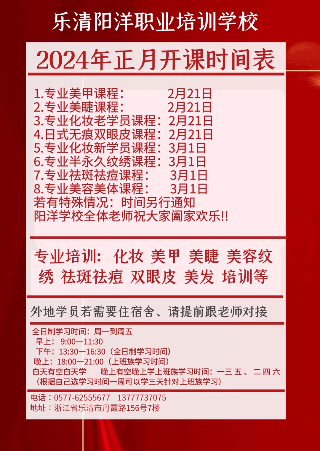 當前位置:樂清市陽洋職業(yè)技能培訓學校 » 學校新聞2024春季開課時間表 樂清哪里學化妝?發(fā)布時間:2024-1-20 16:14:15 瀏覽次數(shù):1956 |