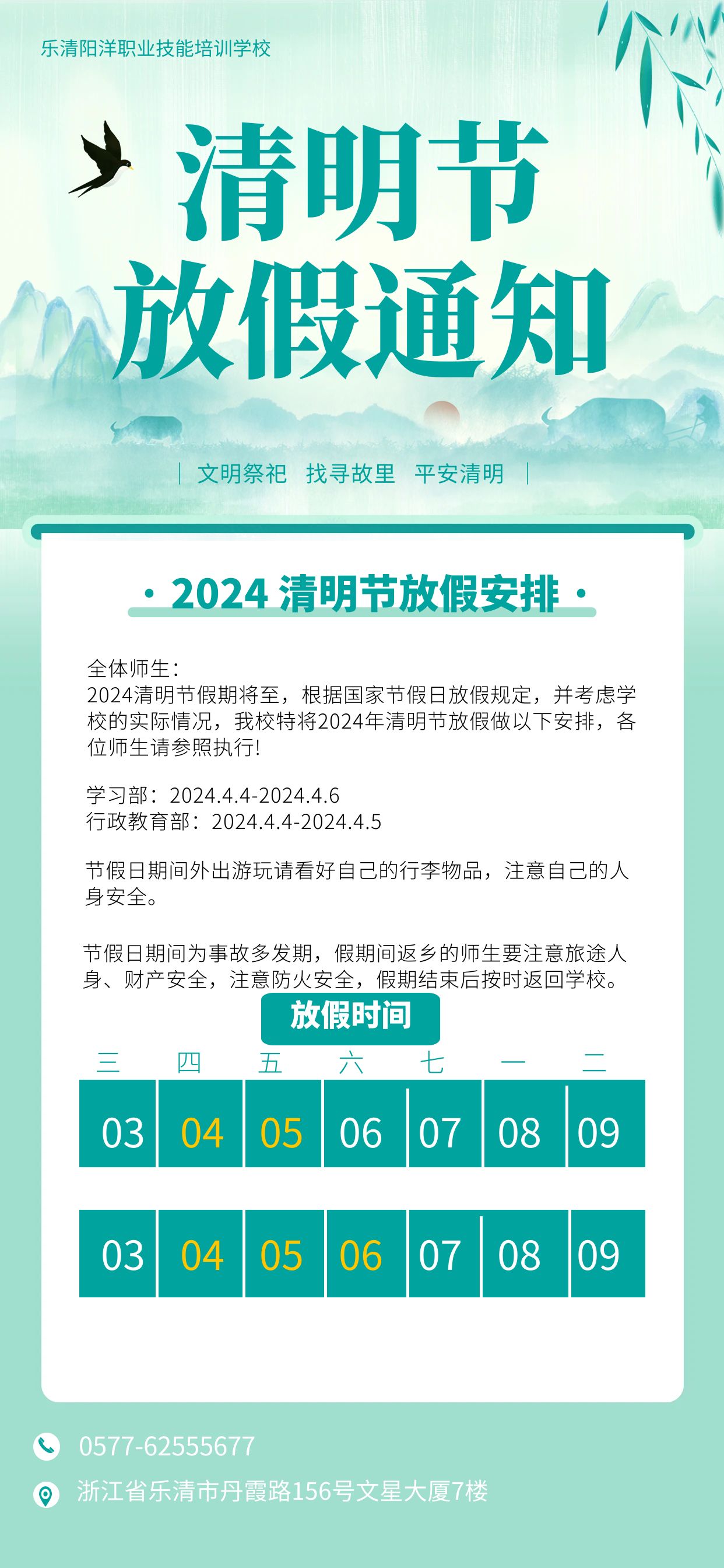 當(dāng)前位置:樂清市陽洋職業(yè)技能培訓(xùn)學(xué)校 » 學(xué)校新聞清明放假通知發(fā)布時間:2024-4-2 9:06:25 瀏覽次數(shù):1961 |