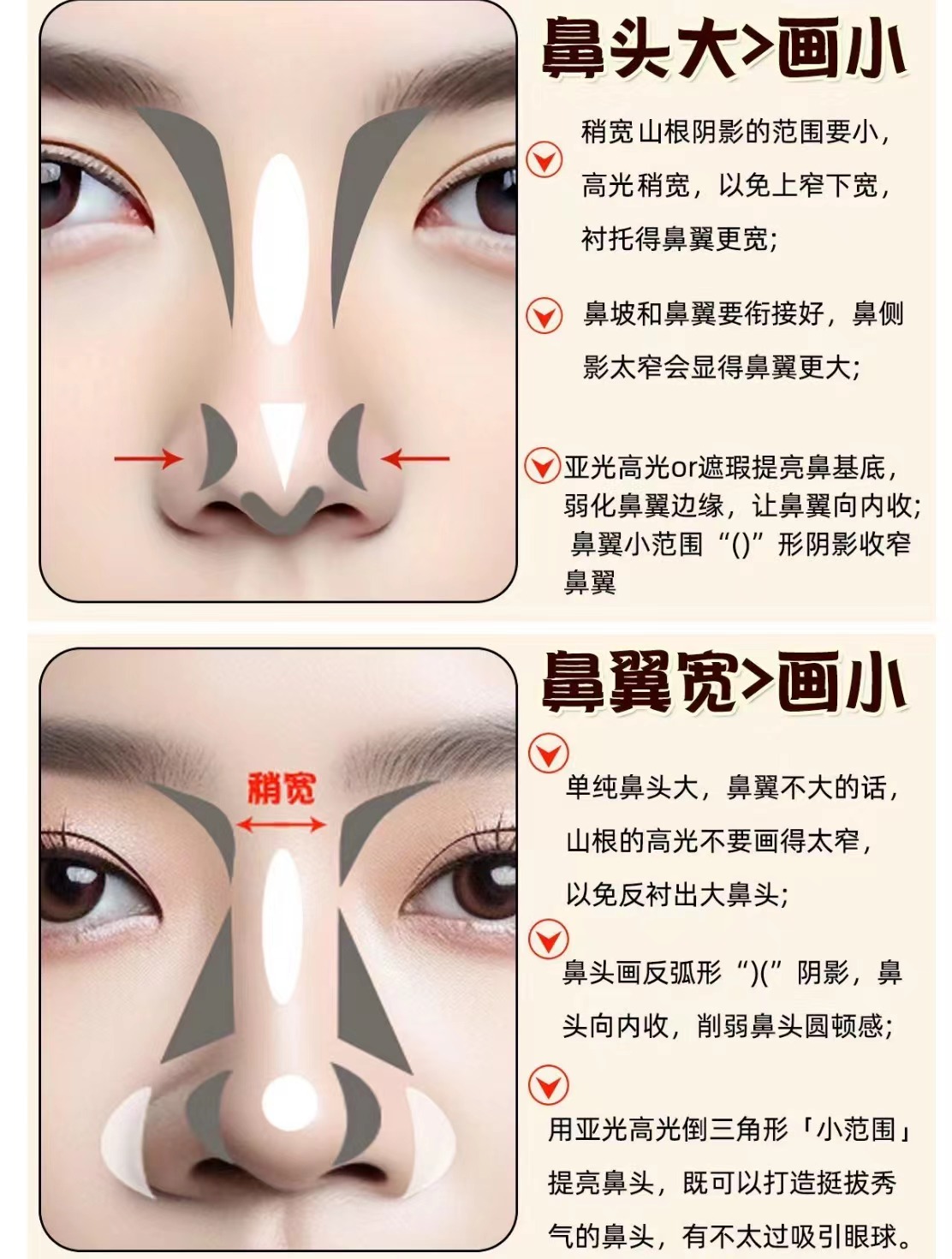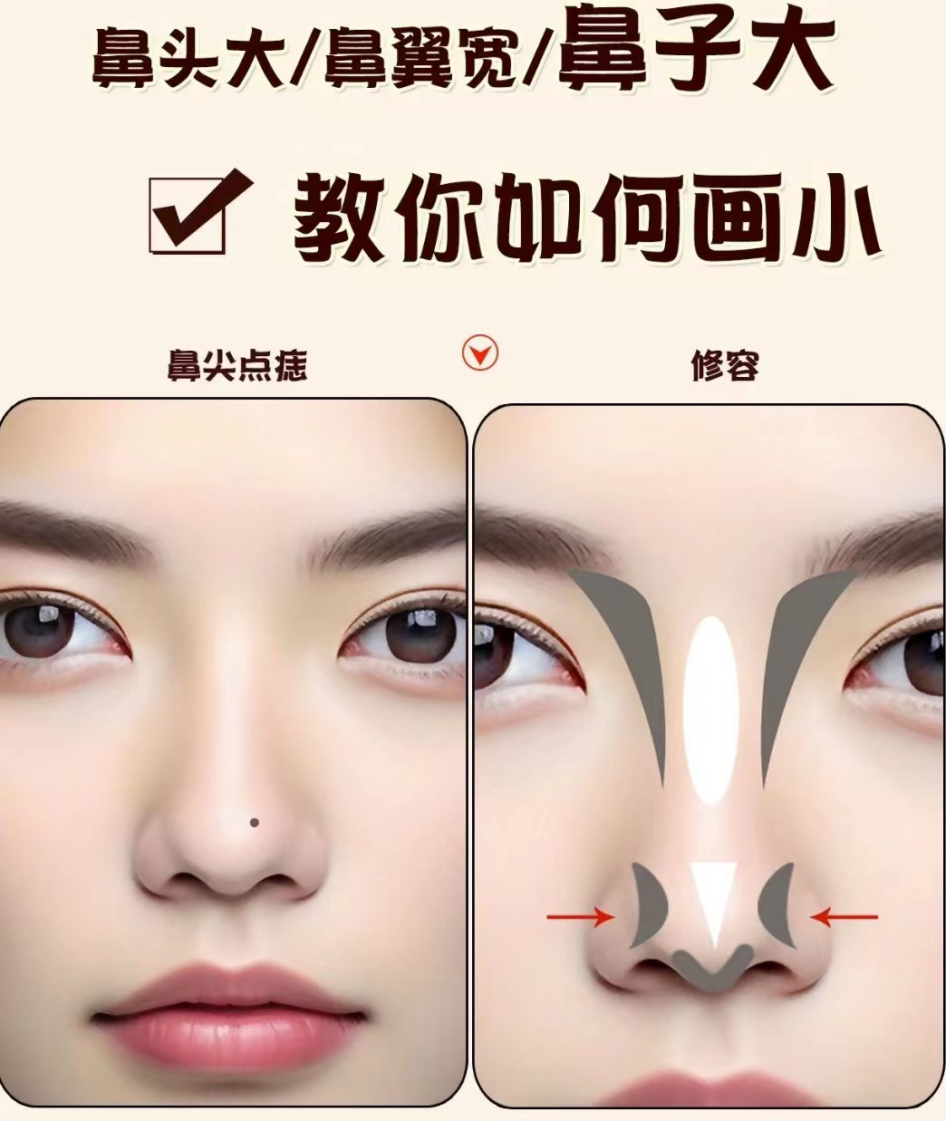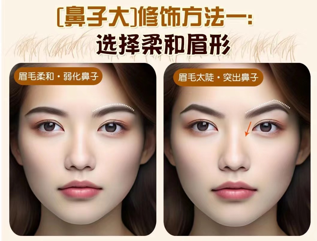 原理: 太陡的眉毛會牽引視線,會讓人順著眉毛的走向關(guān)注到鼻頭。 眉毛犀利的線條也會突出鼻子的圓潤感。 操作方法: 柔和的眉形會減弱這種牽引感 適合眉形: 標(biāo)準(zhǔn)眉、彎月眉 (但也要考慮臉型的去選擇適合的彎眉類型)