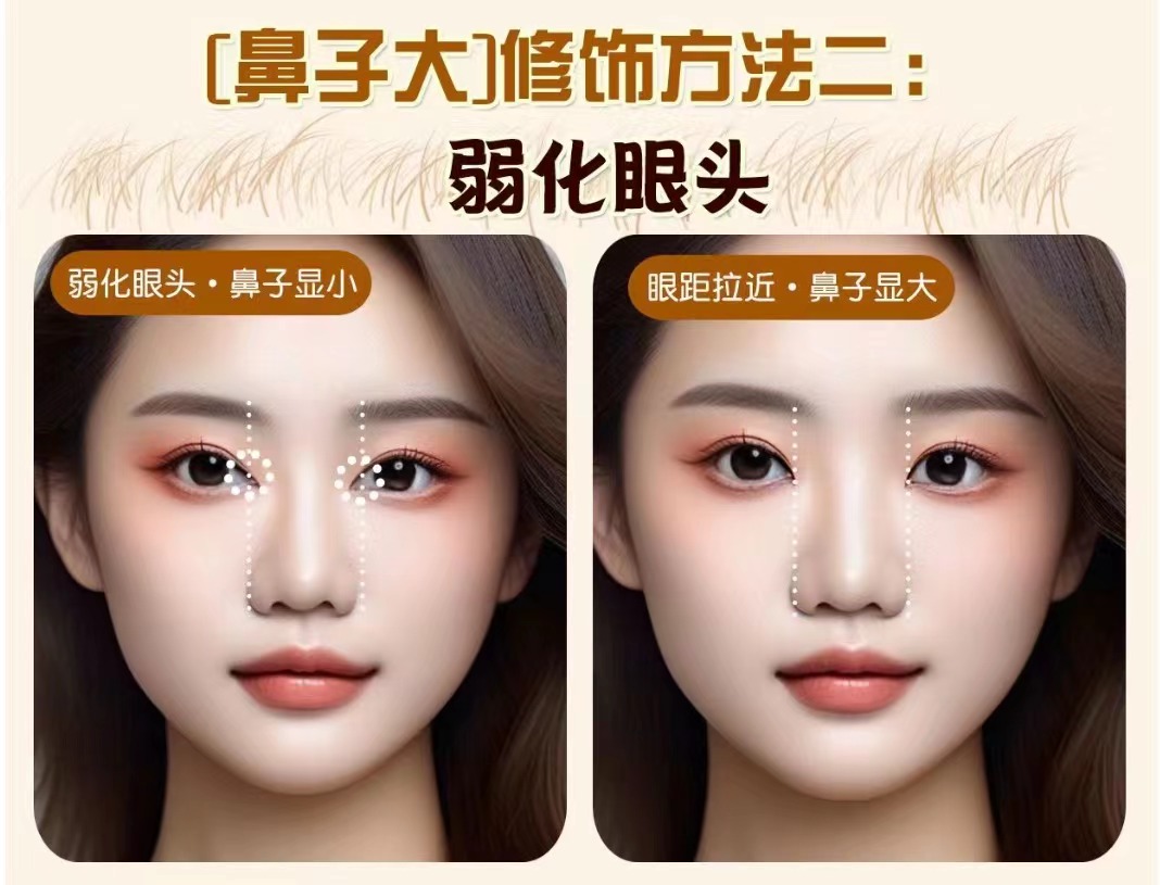 原理: 眼距拉近后會反襯鼻子的寬度,眼距的寬度和鼻翼的寬度會形成一個對比,兩者之間的差距越大,顯得鼻子就越大。 操作方法: x不要開內(nèi)眼角眼線 √弱化內(nèi)眼角,眼妝重點放在眼尾, 眼影可以選擇后移方式