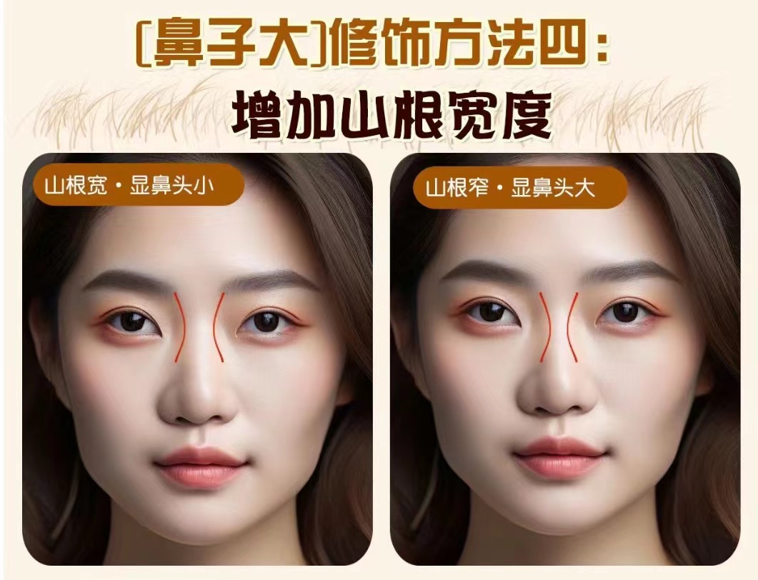 原理: 山根&鼻翼的寬度也會形成對比山根太細也會反襯鼻翼大 操作方法: 鼻子寬的人可以根據(jù)鼻翼的寬度適當(dāng)增加山根寬度