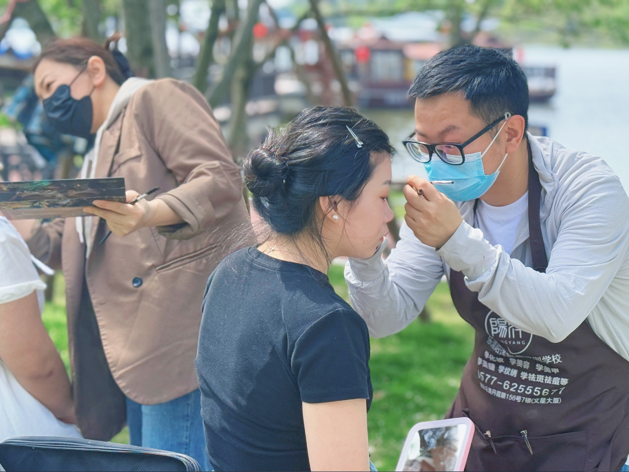 陽(yáng)洋化妝學(xué)校一直秉持著“實(shí)踐出真知”的教學(xué)理念 ,這次活動(dòng)便是最好的體現(xiàn)。與傳統(tǒng)課堂教學(xué)不同,學(xué)校鼓勵(lì)學(xué)生走出教室,在真實(shí)的場(chǎng)景中鍛煉化妝技巧。在清和公園,同學(xué)們一邊感受著漢服文化與自然美景的融合,一邊為模特們精心打造漢服妝。從底妝的輕薄服帖,到眼妝的細(xì)膩勾勒,再到唇妝的點(diǎn)睛之筆,每一個(gè)步驟都一絲不茍。他們根據(jù)不同的漢服款式和模特氣質(zhì),設(shè)計(jì)出風(fēng)格各異的妝容,有的清新淡雅,如春日初綻的花朵;有的華麗大氣,似古代宮廷中的佳人。