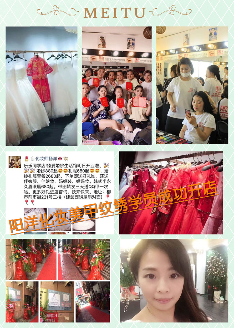 真實(shí)案例: 2016年第三屆陽洋歡歡學(xué)員在本校學(xué)習(xí)了四個(gè)月化妝精英班,美甲就業(yè)班和韓式半永久,畢業(yè)后在柳市開了屬于自己的婚紗生活館!翻身做老板!成為美妝行業(yè)里的一份子。。