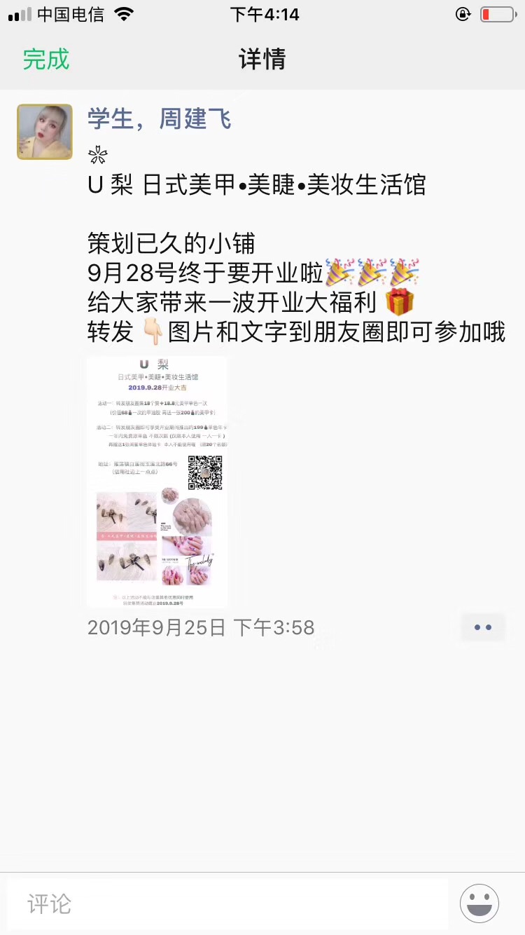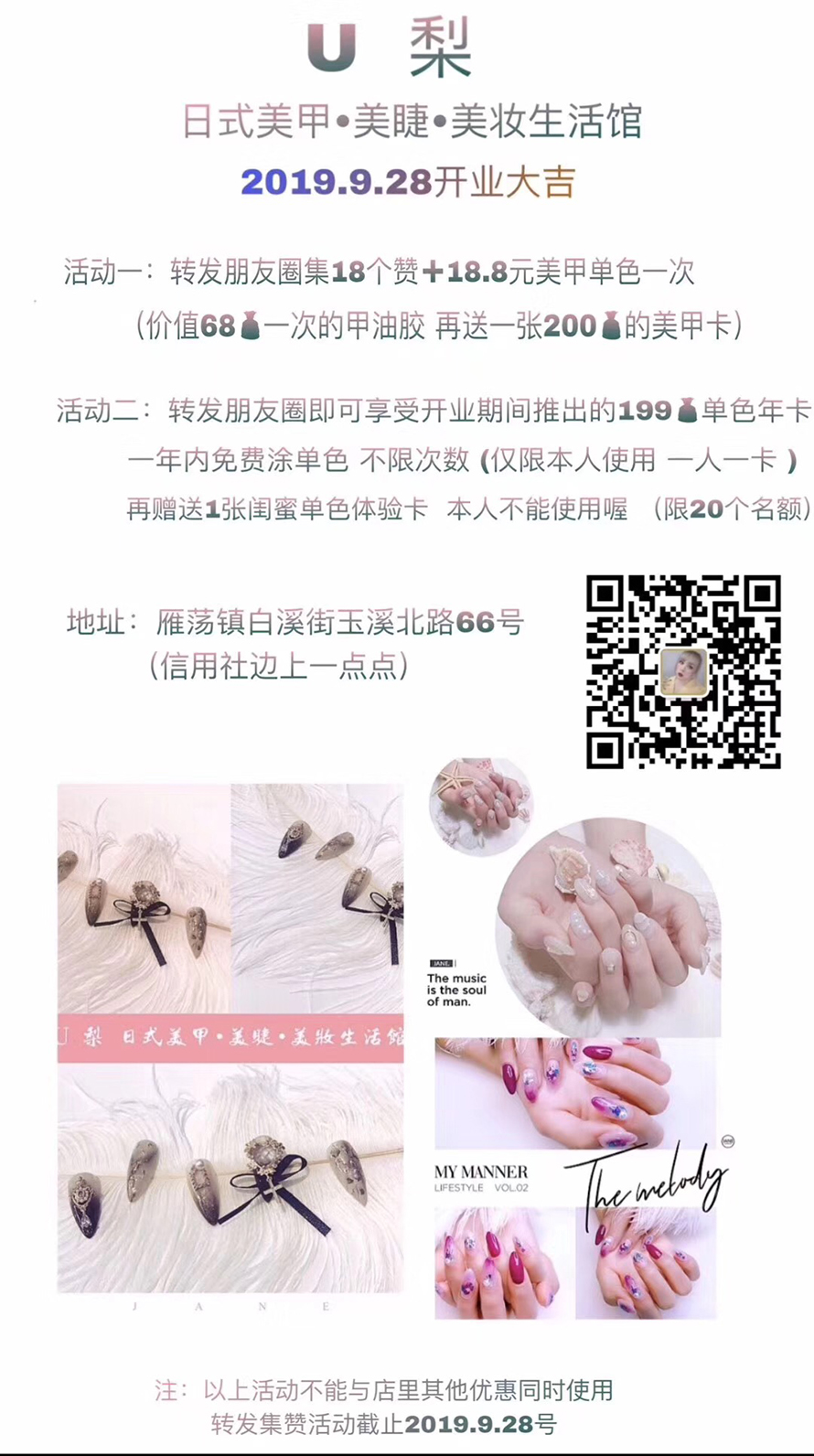 2019年來(lái)自雁蕩的周建飛同學(xué) 3月份來(lái)校報(bào)名學(xué)習(xí),8月份畢業(yè)于陽(yáng)洋化妝學(xué)校 在校學(xué)習(xí)了國(guó)際化妝大師班+美甲創(chuàng)業(yè)班+高級(jí)美睫班+紋繡精英班 八月份畢業(yè),九月份就開(kāi)始自己的創(chuàng)業(yè)之旅 在雁蕩當(dāng)?shù)亻_(kāi)了屬于自己的“U梨”工作室