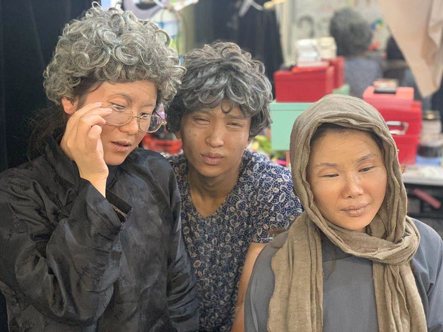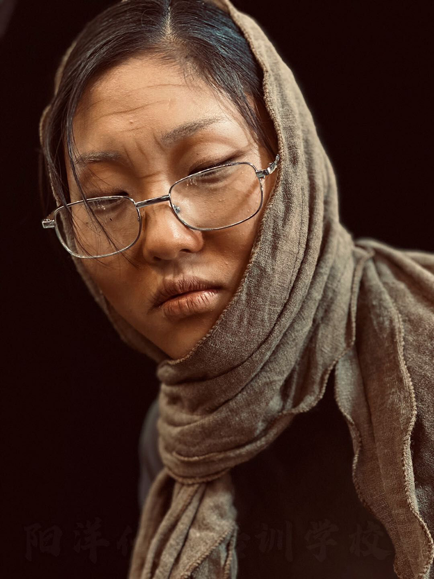 這些老年人的特點,要在妝容中顯現(xiàn)出來。法齡紋、眼窩陷,牙床突出。 下面師陽洋學(xué)校學(xué)員作品:
