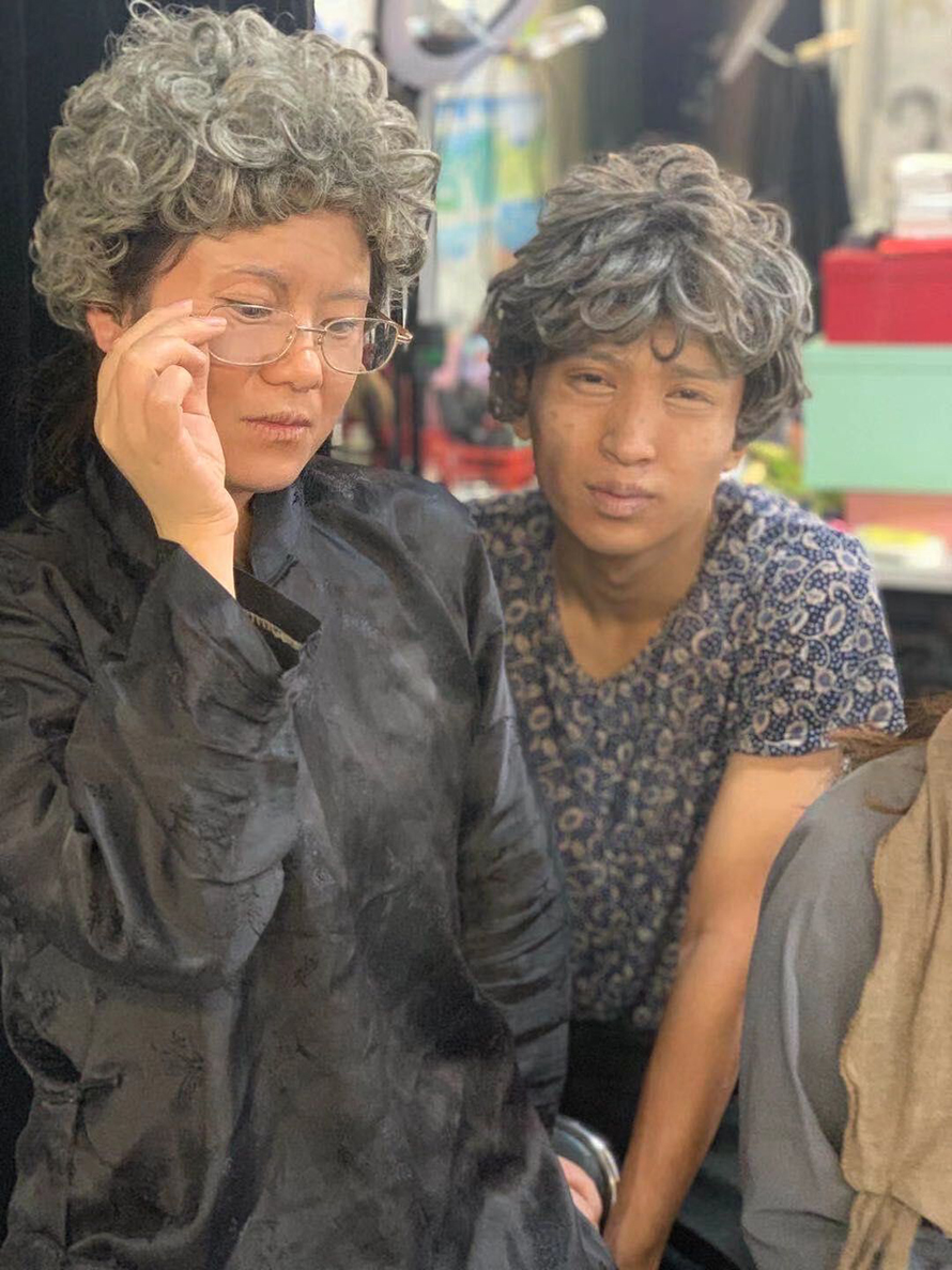 老年妝除非角色有特別要求,否則,多數(shù)會利用光、暗影做出憔悴及瘦削的效果,因為疲比肥在舞臺上更能凸顯老態(tài),眼睛下陷,皺紋、太陽穴及前額凹陷,牙齒松脫及牙肉收縮而引起雙唇下陷,皮膚色澤變得蒼白而不均勻,頭發(fā)、睫毛、眉毛花白。