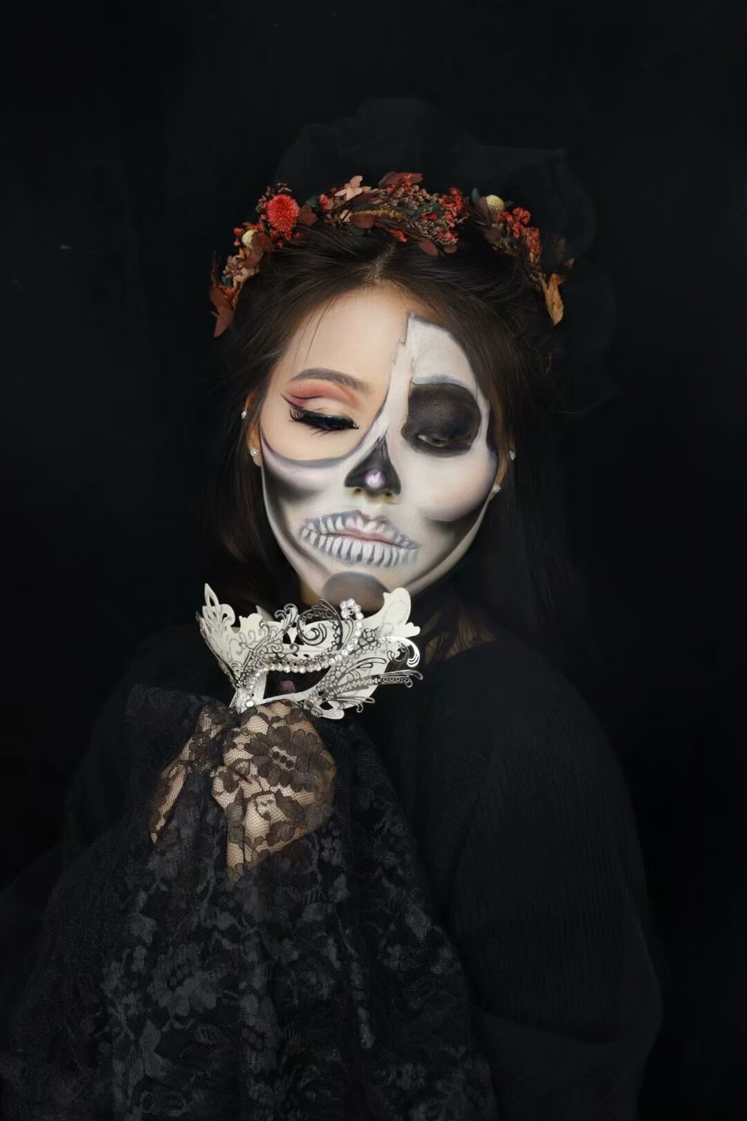 骷髏妝容作為萬圣節(jié)的熱門妝容,近幾年款式也變得越來越豐富,今年較為 流行的是唯美骷髏裝,天使與惡魔的結合,一半一半,不同的色調(diào),不同的妝感 一張臉上完美呈現(xiàn)兩種不同效果