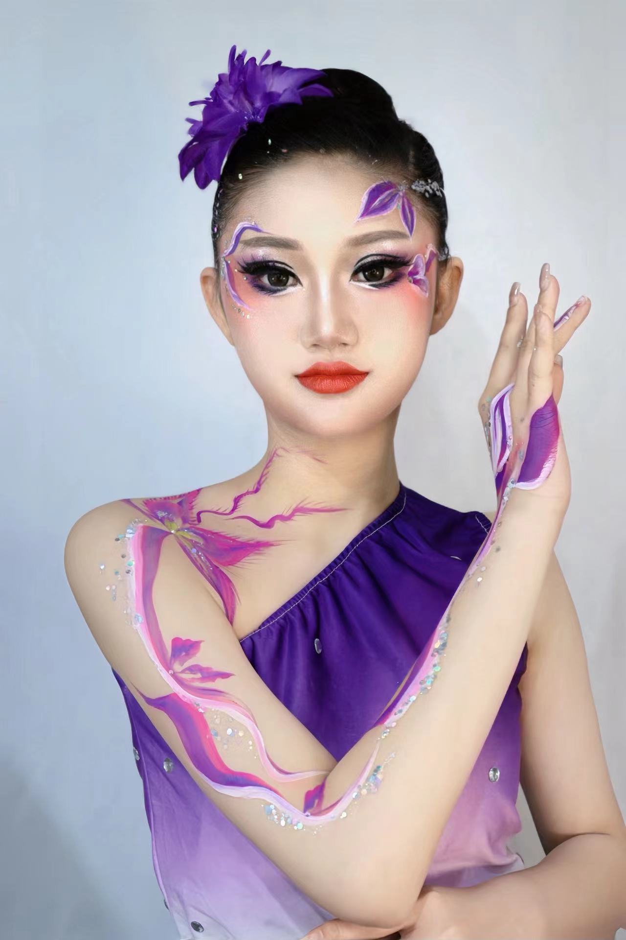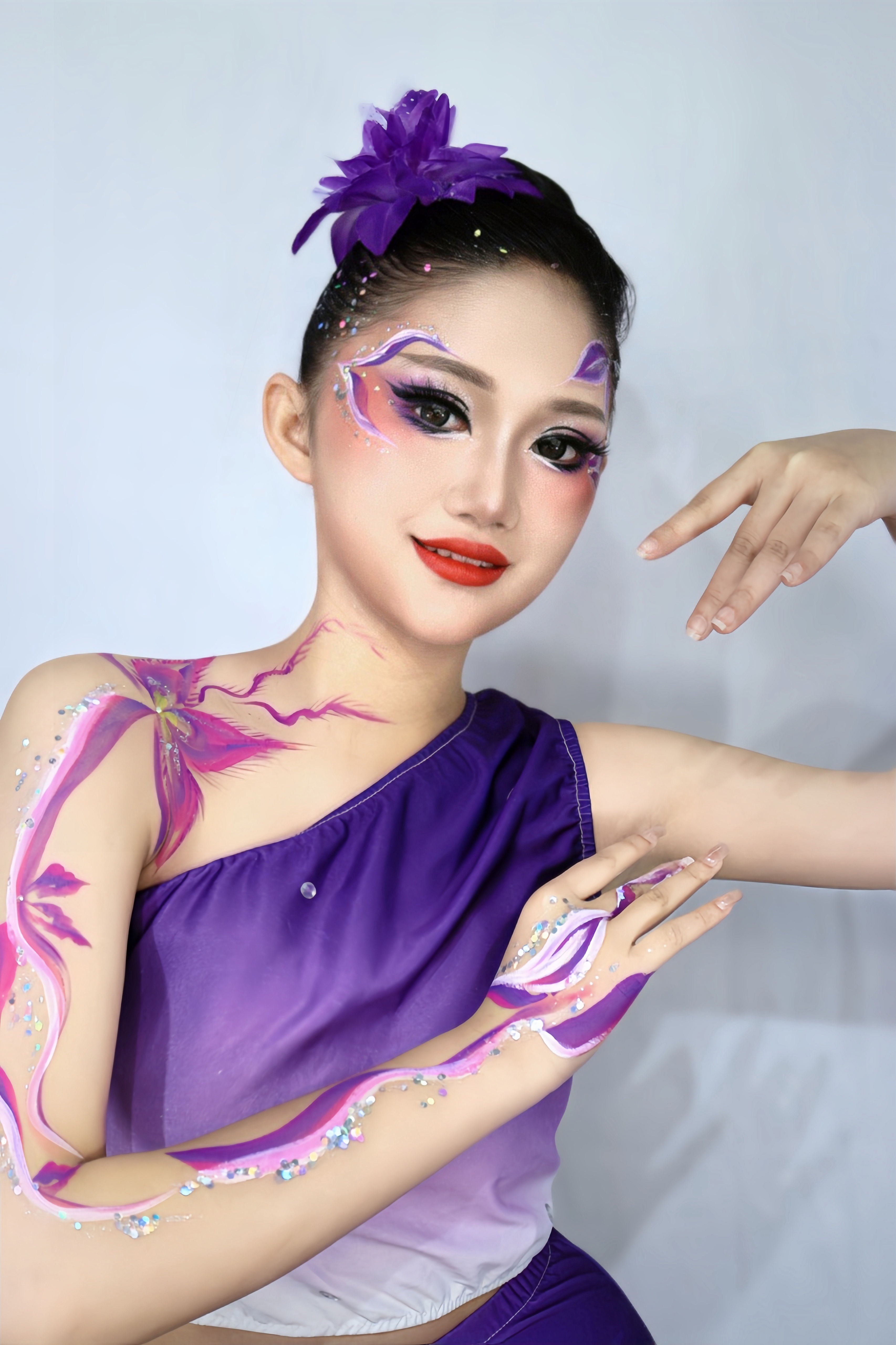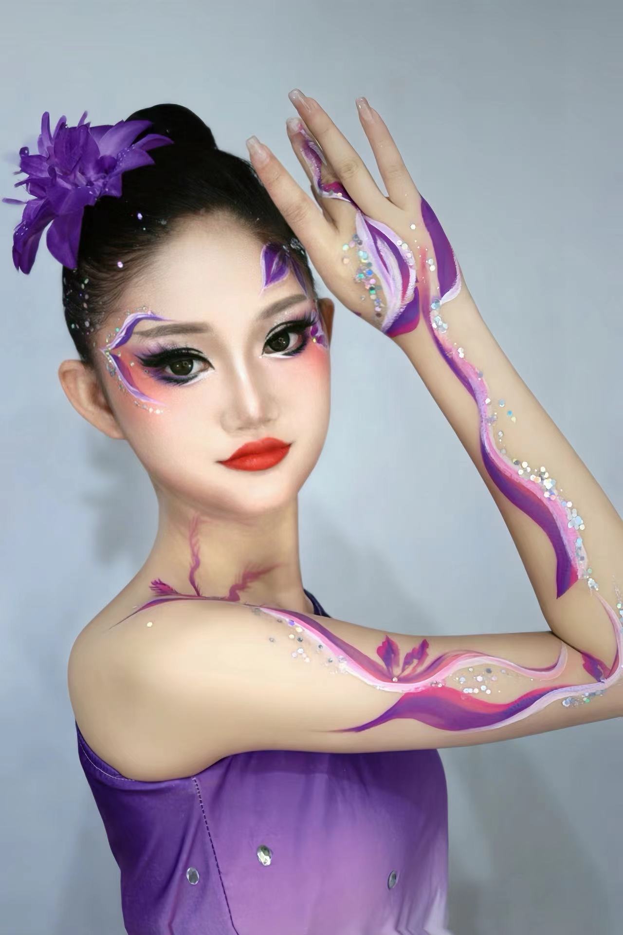 , 面部妝容只是呈現(xiàn)一部分, 加上手臂的彩繪整個(gè)延展線條的流動(dòng)性, 以紫色為主,搭配其他色彩加以點(diǎn)綴, 適量亮鉆的運(yùn)用,更加生動(dòng)又氣質(zhì)。